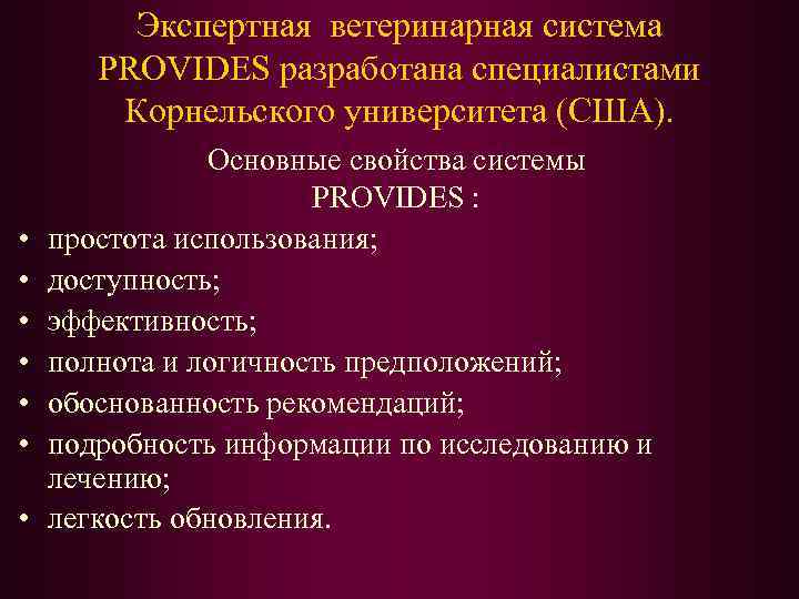 Экспертная ветеринарная система PROVIDES разработана специалистами Корнельского университета (США). • • Основные свойства системы PROVIDES : простота использования; доступность; эффективность; полнота и логичность предположений; обоснованность рекомендаций; подробность информации по исследованию и лечению; легкость обновления.