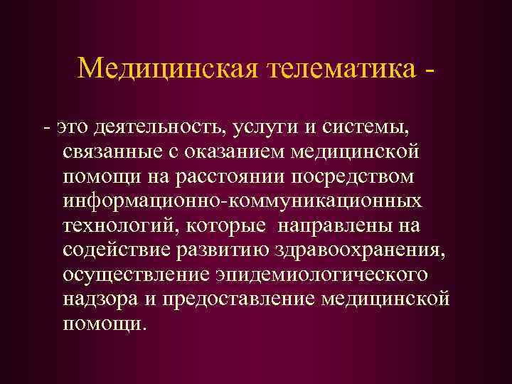 Медицинская телематика - это деятельность, услуги и системы, связанные с оказанием медицинской помощи на расстоянии посредством информационно-коммуникационных технологий, которые направлены на содействие развитию здравоохранения, осуществление эпидемиологического надзора и предоставление медицинской помощи.