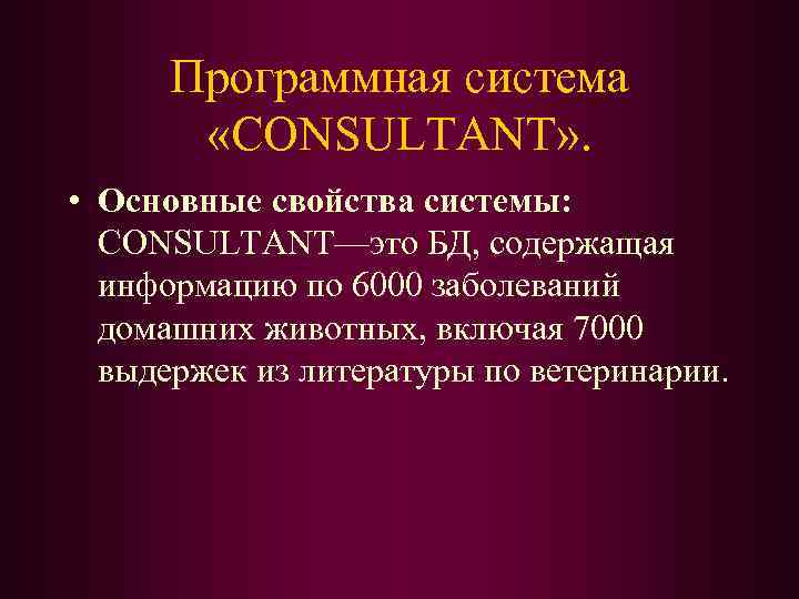Программная система «CONSULTANT» . • Основные свойства системы: CONSULTANT—это БД, содержащая информацию по 6000 заболеваний домашних животных, включая 7000 выдержек из литературы по ветеринарии.