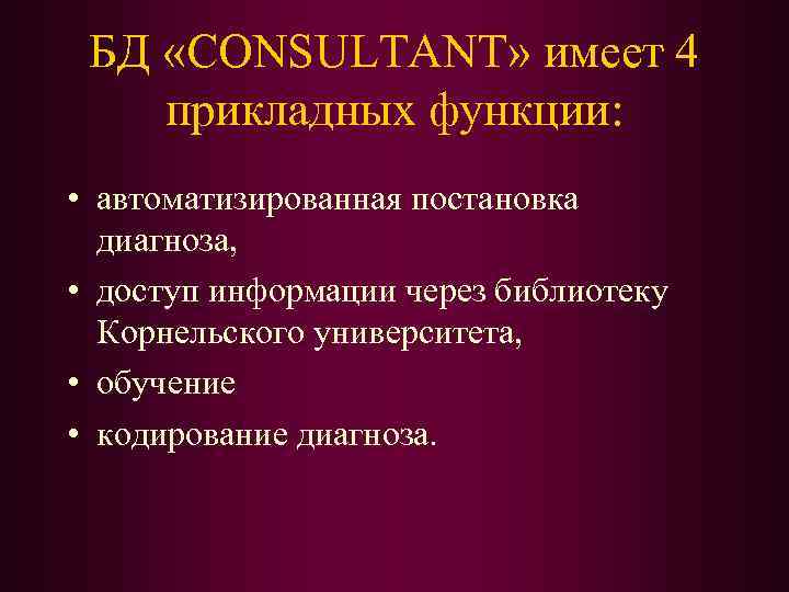 БД «CONSULTANT» имеет 4 прикладных функции: • автоматизированная постановка диагноза, • доступ информации через библиотеку Корнельского университета, • обучение • кодирование диагноза.