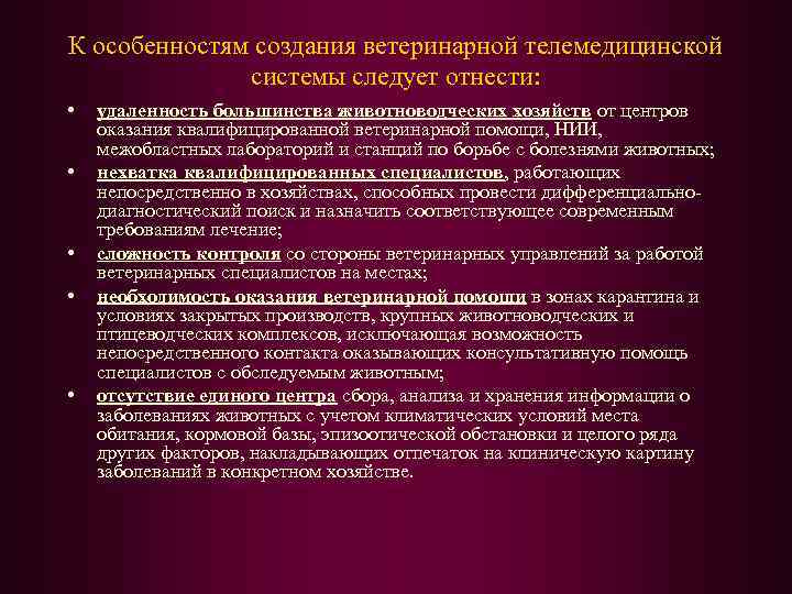 К особенностям создания ветеринарной телемедицинской системы следует отнести: • • • удаленность большинства животноводческих хозяйств от центров оказания квалифицированной ветеринарной помощи, НИИ, межобластных лабораторий и станций по борьбе с болезнями животных; нехватка квалифицированных специалистов, работающих непосредственно в хозяйствах, способных провести дифференциальнодиагностический поиск и назначить соответствующее современным требованиям лечение; сложность контроля со стороны ветеринарных управлений за работой ветеринарных специалистов на местах; необходимость оказания ветеринарной помощи в зонах карантина и условиях закрытых производств, крупных животноводческих и птицеводческих комплексов, исключающая возможность непосредственного контакта оказывающих консультативную помощь специалистов с обследуемым животным; отсутствие единого центра сбора, анализа и хранения информации о заболеваниях животных с учетом климатических условий места обитания, кормовой базы, эпизоотической обстановки и целого ряда других факторов, накладывающих отпечаток на клиническую картину заболеваний в конкретном хозяйстве.