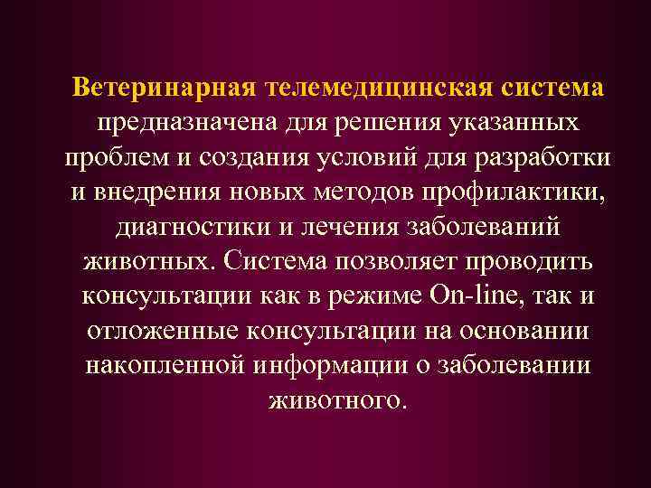 Ветеринарная телемедицинская система предназначена для решения указанных проблем и создания условий для разработки и внедрения новых методов профилактики, диагностики и лечения заболеваний животных. Cистема позволяет проводить консультации как в режиме On-line, так и отложенные консультации на основании накопленной информации о заболевании животного.