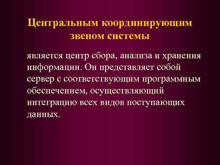 Центральным координирующим звеном системы является центр сбора, анализа и хранения информации. Он представляет собой сервер с соответствующим программным обеспечением, осуществляющий интеграцию всех видов поступающих данных.