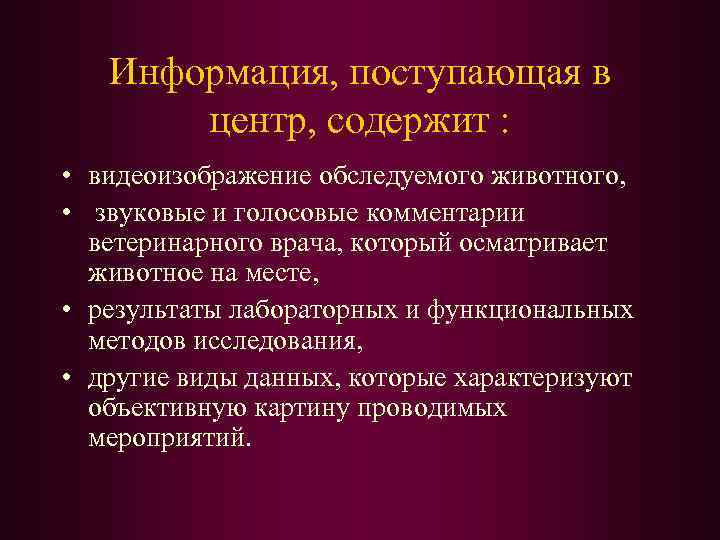Информация, поступающая в центр, содержит : • видеоизображение обследуемого животного, • звуковые и голосовые комментарии ветеринарного врача, который осматривает животное на месте, • результаты лабораторных и функциональных методов исследования, • другие виды данных, которые характеризуют объективную картину проводимых мероприятий.