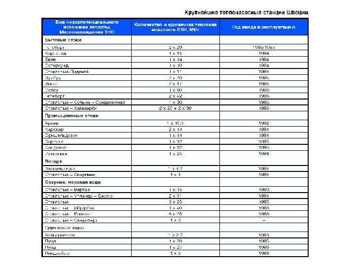 Экологическая эффективность тепловых насосов по сравнению с традиционными котельными, работающими на органическом топливе (расчеты выполнялись для котельных тепловой мощностью 1. 163 Мвт (1. 0 Гкал/час), с годовой выработкой тепловой энергии 2 616 Гкал ; расход топлива на ТЭЦ – 0, 3 кг условного топлива на 1 квт/час; теплотворная способность : угля – 19, 5 Мдж/кг, мазута – 39, 0 Мдж/кг, природного газа – 33, 24 Мдж/кг. )