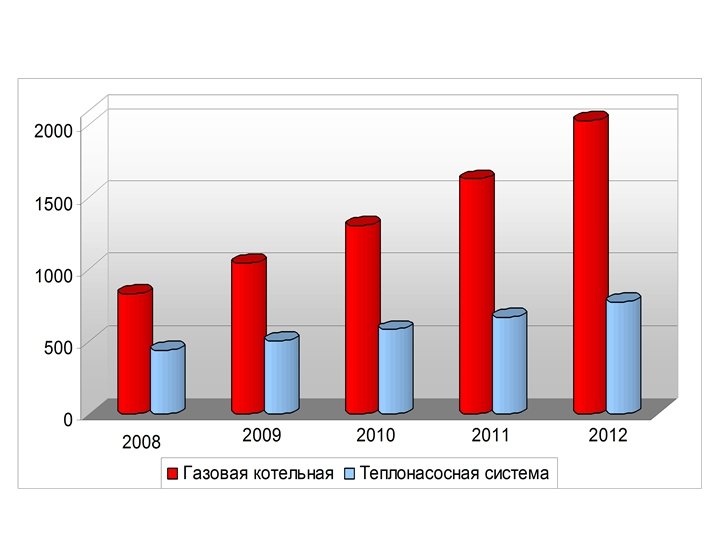 Изменения затрат на производство 1 Гкал тепловой энергии газовой котельной и теплонасосной системой Год Затраты на производство 1 Гкал тепловой энергии , руб Газовая котельная Теплонасосная система 2008 832, 0 440, 0 2009 1040, 0 506, 0 2010 1300, 0 581, 0 2011 1625, 0 669, 0 2012 2031, 0 769, 5