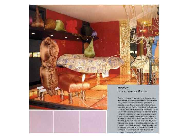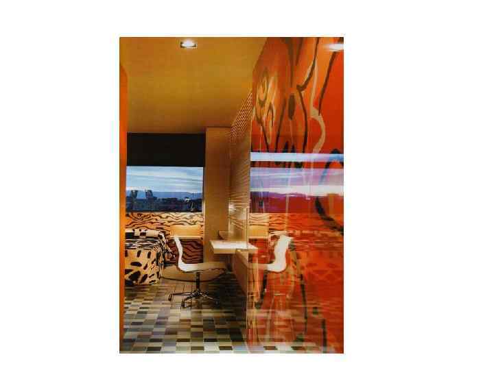 • Заказчик этого офиса, руководитель киевского рекламного агенства, был согласен на самый неожиданный, даже агрессивный дизайн, ведь оригинальность – залог успеха его бизнеса. • Интерьер – взрывающий. Провоцирующий, должен был освобождать от рутины, сметать банальность, дабы на обломах стереотипов торжествовало творчество. • Основной удар творческой смелости дизайнера приняли на себя офисные стены. • Наиболее смелый дизайн – в зоне ресепшена, на перекрёстке информационных потоков. Ошарашить, поразить, зарядить энергией, убедить, погрузив в омут красок и символов, - таково предназначение этой зоны. Атмосфера в комнате для встреч более спокойная. • Создано пространство, будоражащее сознание. Что и требовалосьб заказчику, уверенному в прямой зависимости между стимулирующим окружением и креативностью. Освобождение от привычного контекста – первый шаг к проявлению ярких идей.