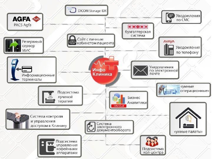 Основные информационные системы ОАО «Медицина» (более 50) МИС «Инфоклиника» состоит: Клиническая информационная система Госпитальная информационная система Лабораторная информационная система Радиологическая информационная система МИС «Радиотерапия» Система электронного документооборота «ЭСКАДО» на основе Lotus. Notes Системы бухгалтерского учета «ИНФИН» , « 1 С: Управление Торговлей» , « 1 С: Зарплата и Управление Персоналом» . Аптека 2005 Комплекс автоматизированной финансовой деятельности Hyperion, Казначейство, BI, DWH.