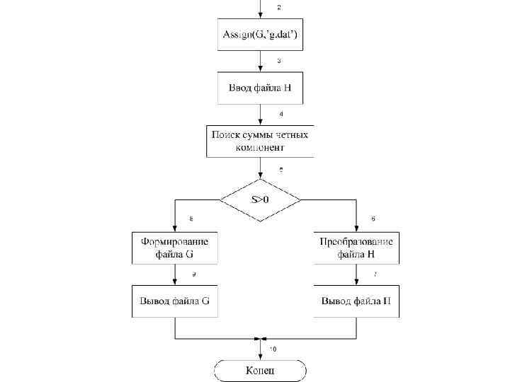 ПРИМЕРЫ РЕШЕНИЯ ЗАДАЧ Задача 1. В заданном числовом файле H найти сумму четных компонент. Если сумма больше нуля, то найти максимальную компоненту и записать ее в конец файла. В противном случае сформировать файл G, в который записать положительные компоненты файла H.