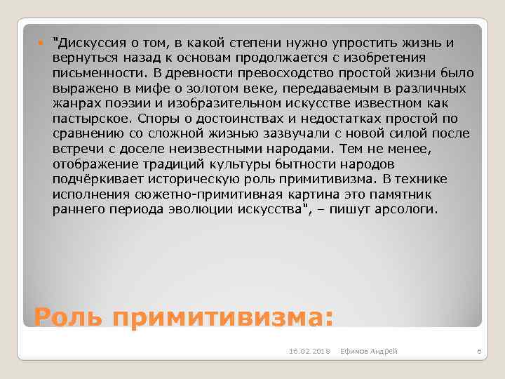"Дискуссия о том, в какой степени нужно упростить жизнь и вернуться назад к основам продолжается с изобретения письменности. В древности превосходство простой жизни было выражено в мифе о золотом веке, передаваемым в различных жанрах поэзии и изобразительном искусстве известном как пастырское. Споры о достоинствах и недостатках простой по сравнению со сложной жизнью зазвучали с новой силой после встречи с доселе неизвестными народами. Тем не менее, отображение традиций культуры бытности народов подчёркивает историческую роль примитивизма. В технике исполнения сюжетно-примитивная картина это памятник раннего периода эволюции искусства", – пишут арсологи. Роль примитивизма: 16. 02. 2018 Ефимов Андрей 6