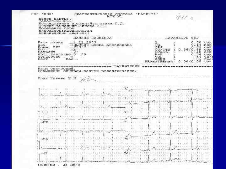 ЭКГ (от 18. 02. 2004 г. ): электрическая ось смещена влево (левограмма), переходная зона в норме.