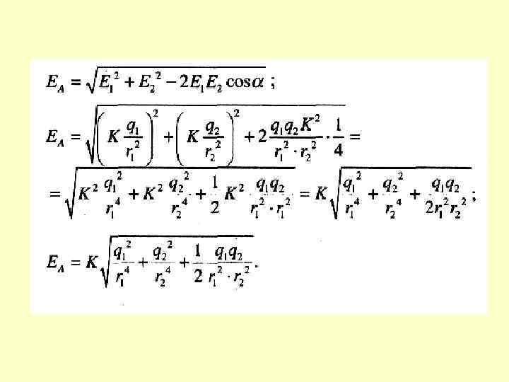 Ступень сложности 5 Два точечных заряда 5 • 10 -9 Кл и -2, 7 • 10 -9 Кл расположены на расстоянии 40 см друг от друга. Найти напряженность поля в точке А, находящейся на расстоянии 20 см от первого заряда и 30 см от второго заряда.