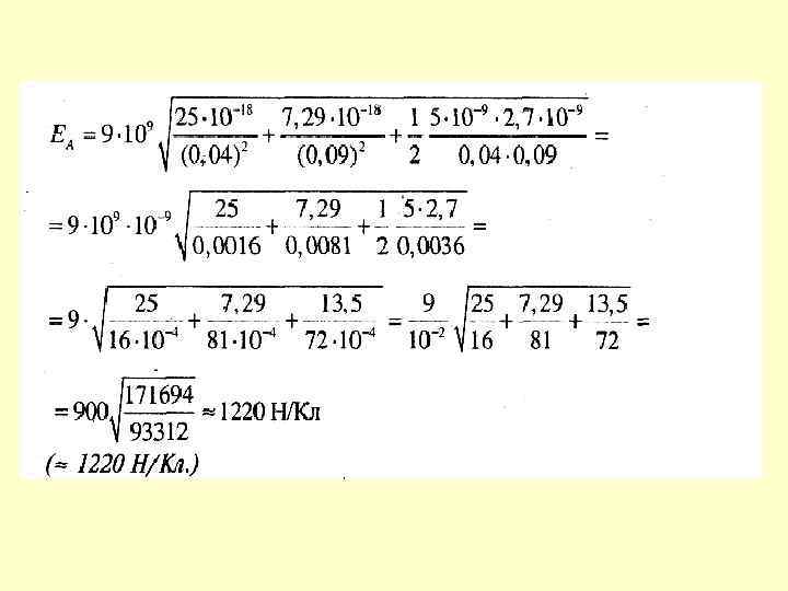 Ступень сложности 4 Два одноименных заряда величиной по 10 – 7 Кл расположены на расстоянии 12 см друг от друга. Какова напряженность поля в точке, расположенной на перпендикуляре, восстановленном из середины прямой, соединяющей заряды, и удаленной от этой прямой на 16 см?