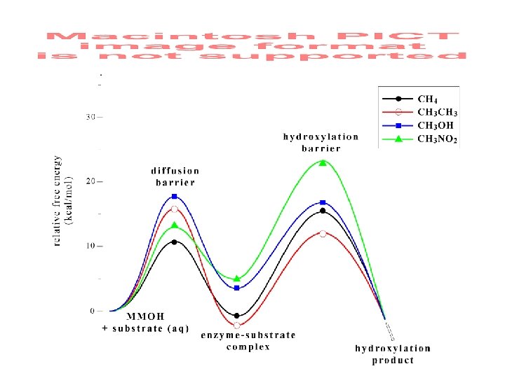 QM/MM Summary for Q Hydroxylation of CH 3 X: Substrate Diffusion Barriers • Substrate diffusion barriers cannot be calculated within the QM/MM framework, but can be inferred from experimental data and QM/MM calculations. • Results for cases where KIE = 1 Ethane 12. 15 kcal/mol; methanol 16. 67 kcal/mol • For methane, barrier should be less than ethane, since MMOB tunes the substrate access channel preferentially to methane as a substrate (Lipscomb and co-workers). • For CH 3 CN, barrier is less than 13. 5 kcal/mol. • For CH 3 NO 2, barrier is approximately that of acetonitrile.