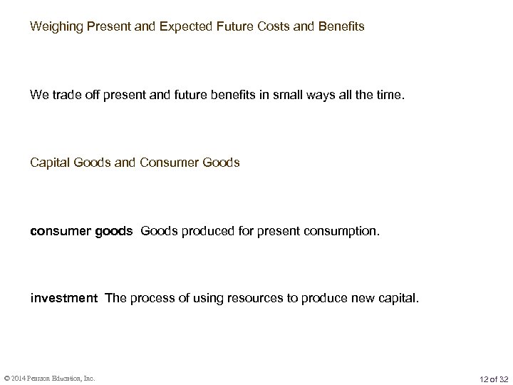 Weighing Present and Expected Future Costs and Benefits We trade off present and future benefits in small ways all the time. Capital Goods and Consumer Goods consumer goods Goods produced for present consumption. investment The process of using resources to produce new capital. © 2014 Pearson Education, Inc. 12 of 32
