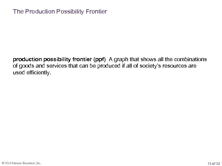The Production Possibility Frontier production possibility frontier (ppf) A graph that shows all the combinations of goods and services that can be produced if all of society’s resources are used efficiently. © 2014 Pearson Education, Inc. 13 of 32