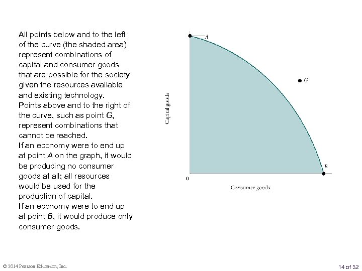 All points below and to the left of the curve (the shaded area) represent combinations of capital and consumer goods that are possible for the society given the resources available and existing technology. Points above and to the right of the curve, such as point G, represent combinations that cannot be reached. If an economy were to end up at point A on the graph, it would be producing no consumer goods at all; all resources would be used for the production of capital. If an economy were to end up at point B, it would produce only consumer goods. © 2014 Pearson Education, Inc. 14 of 32
