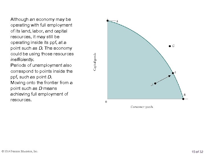 Although an economy may be operating with full employment of its land, labor, and capital resources, it may still be operating inside its ppf, at a point such as D. The economy could be using those resources inefficiently. Periods of unemployment also correspond to points inside the ppf, such as point D. Moving onto the frontier from a point such as D means achieving full employment of resources. © 2014 Pearson Education, Inc. 15 of 32