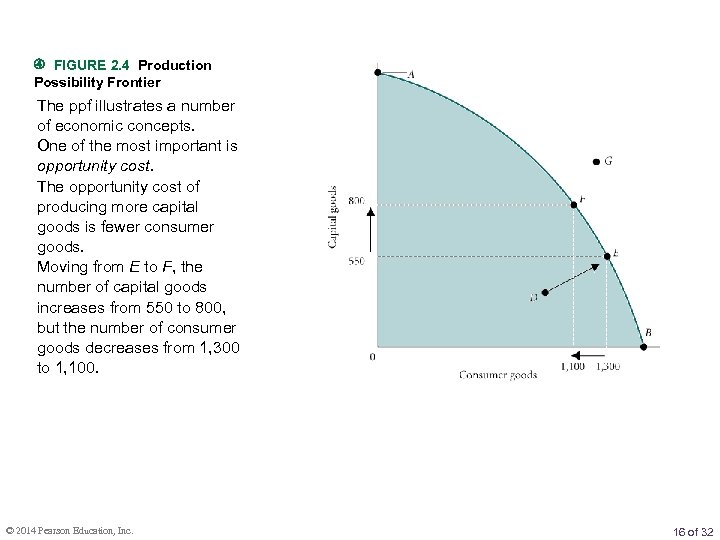 FIGURE 2. 4 Production Possibility Frontier The ppf illustrates a number of economic concepts. One of the most important is opportunity cost. The opportunity cost of producing more capital goods is fewer consumer goods. Moving from E to F, the number of capital goods increases from 550 to 800, but the number of consumer goods decreases from 1, 300 to 1, 100. © 2014 Pearson Education, Inc. 16 of 32
