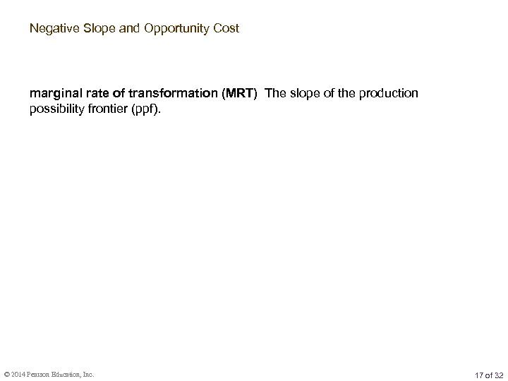 Negative Slope and Opportunity Cost marginal rate of transformation (MRT) The slope of the production possibility frontier (ppf). © 2014 Pearson Education, Inc. 17 of 32