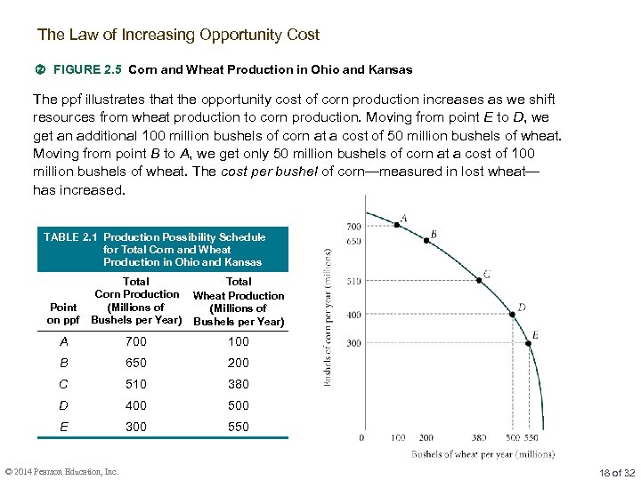 The Law of Increasing Opportunity Cost FIGURE 2. 5 Corn and Wheat Production in Ohio and Kansas The ppf illustrates that the opportunity cost of corn production increases as we shift resources from wheat production to corn production. Moving from point E to D, we get an additional 100 million bushels of corn at a cost of 50 million bushels of wheat. Moving from point B to A, we get only 50 million bushels of corn at a cost of 100 million bushels of wheat. The cost per bushel of corn—measured in lost wheat— has increased. TABLE 2. 1 Production Possibility Schedule for Total Corn and Wheat Production in Ohio and Kansas Point on ppf Total Corn Production (Millions of Bushels per Year) Total Wheat Production (Millions of Bushels per Year) A 700 100 B 650 200 C 510 380 D 400 500 E 300 550 © 2014 Pearson Education, Inc. 18 of 32