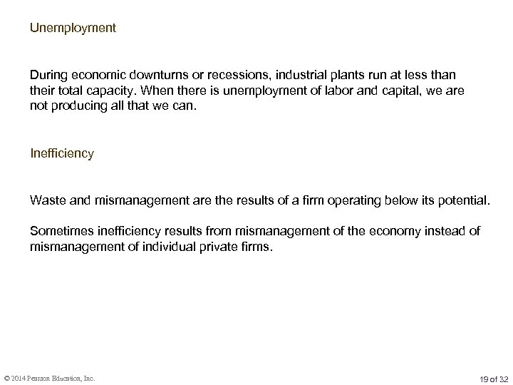 Unemployment During economic downturns or recessions, industrial plants run at less than their total capacity. When there is unemployment of labor and capital, we are not producing all that we can. Inefficiency Waste and mismanagement are the results of a firm operating below its potential. Sometimes inefficiency results from mismanagement of the economy instead of mismanagement of individual private firms. © 2014 Pearson Education, Inc. 19 of 32