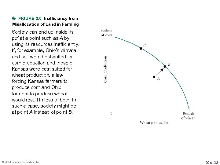 FIGURE 2. 6 Inefficiency from Misallocation of Land in Farming Society can end up inside its ppf at a point such as A by using its resources inefficiently. If, for example, Ohio’s climate and soil were best-suited for corn production and those of Kansas were best suited for wheat production, a law forcing Kansas farmers to produce corn and Ohio farmers to produce wheat would result in less of both. In such a case, society might be at point A instead of point B. © 2014 Pearson Education, Inc. 20 of 32