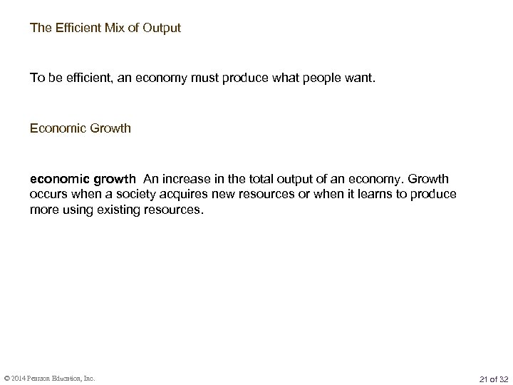 The Efficient Mix of Output To be efficient, an economy must produce what people want. Economic Growth economic growth An increase in the total output of an economy. Growth occurs when a society acquires new resources or when it learns to produce more using existing resources. © 2014 Pearson Education, Inc. 21 of 32