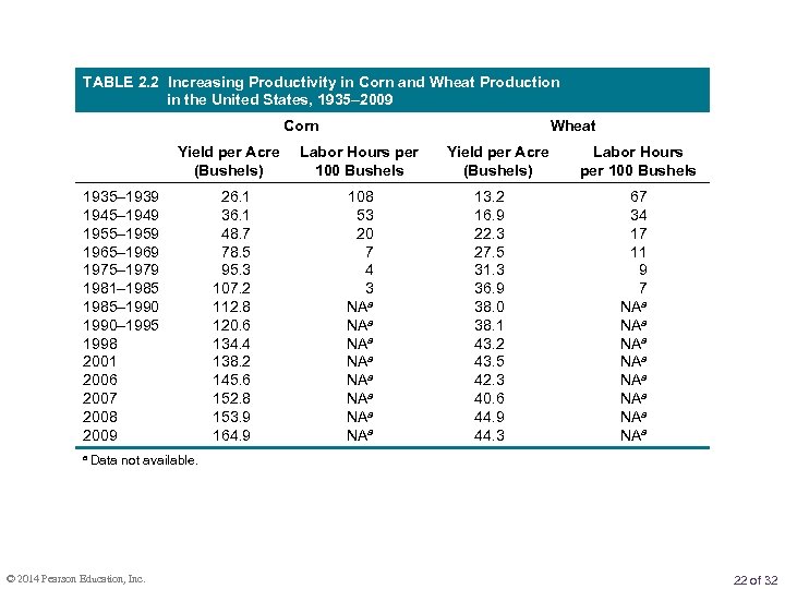 TABLE 2. 2 Increasing Productivity in Corn and Wheat Production in the United States, 1935– 2009 Corn Wheat Yield per Acre (Bushels) Labor Hours per 100 Bushels 26. 1 36. 1 48. 7 78. 5 95. 3 107. 2 112. 8 120. 6 134. 4 138. 2 145. 6 152. 8 153. 9 164. 9 108 53 20 7 4 3 NAa NAa 1935– 1939 1945– 1949 1955– 1959 1965– 1969 1975– 1979 1981– 1985– 1990– 1995 1998 2001 2006 2007 2008 2009 a Data Yield per Acre (Bushels) 13. 2 16. 9 22. 3 27. 5 31. 3 36. 9 38. 0 38. 1 43. 2 43. 5 42. 3 40. 6 44. 9 44. 3 Labor Hours per 100 Bushels 67 34 17 11 9 7 NAa NAa not available. © 2014 Pearson Education, Inc. 22 of 32