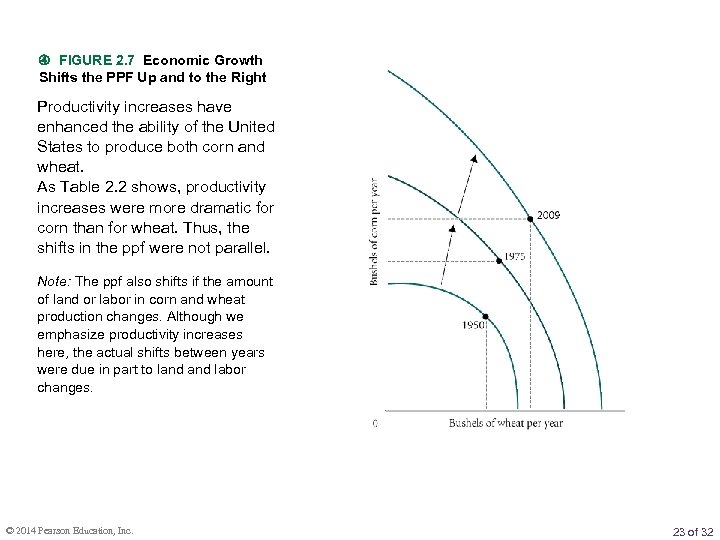 FIGURE 2. 7 Economic Growth Shifts the PPF Up and to the Right Productivity increases have enhanced the ability of the United States to produce both corn and wheat. As Table 2. 2 shows, productivity increases were more dramatic for corn than for wheat. Thus, the shifts in the ppf were not parallel. Note: The ppf also shifts if the amount of land or labor in corn and wheat production changes. Although we emphasize productivity increases here, the actual shifts between years were due in part to land labor changes. © 2014 Pearson Education, Inc. 23 of 32
