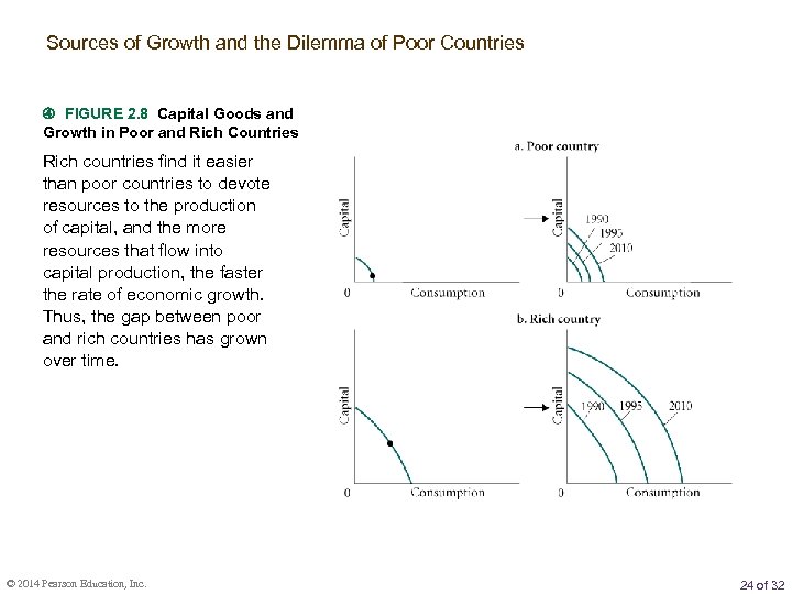 Sources of Growth and the Dilemma of Poor Countries FIGURE 2. 8 Capital Goods and Growth in Poor and Rich Countries Rich countries find it easier than poor countries to devote resources to the production of capital, and the more resources that flow into capital production, the faster the rate of economic growth. Thus, the gap between poor and rich countries has grown over time. © 2014 Pearson Education, Inc. 24 of 32