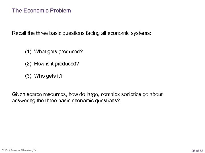 The Economic Problem Recall the three basic questions facing all economic systems: (1) What gets produced? (2) How is it produced? (3) Who gets it? Given scarce resources, how do large, complex societies go about answering the three basic economic questions? © 2014 Pearson Education, Inc. 26 of 32