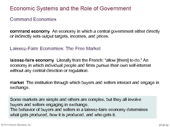 Economic Systems and the Role of Government Command Economies command economy An economy in which a central government either directly or indirectly sets output targets, incomes, and prices. Laissez-Faire Economies: The Free Market laissez-faire economy Literally from the French: “allow [them] to do. ” An economy in which individual people and firms pursue their own self-interest without any central direction or regulation. market The institution through which buyers and sellers interact and engage in exchange. Some markets are simple and others are complex, but they all involve buyers and sellers engaging in exchange. The behavior of buyers and sellers in a laissez-faire economy determines what gets produced, how it is produced, and who gets it. © 2014 Pearson Education, Inc. 27 of 32