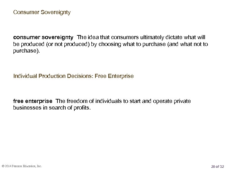 Consumer Sovereignty consumer sovereignty The idea that consumers ultimately dictate what will be produced (or not produced) by choosing what to purchase (and what not to purchase). Individual Production Decisions: Free Enterprise free enterprise The freedom of individuals to start and operate private businesses in search of profits. © 2014 Pearson Education, Inc. 28 of 32