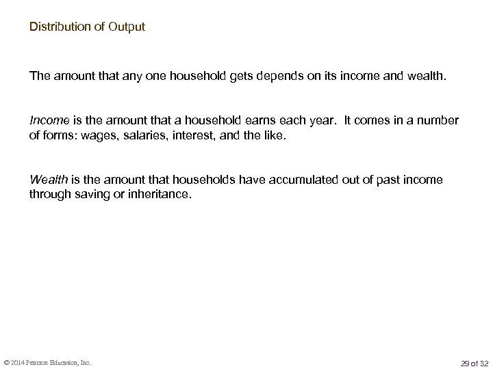Distribution of Output The amount that any one household gets depends on its income and wealth. Income is the amount that a household earns each year. It comes in a number of forms: wages, salaries, interest, and the like. Wealth is the amount that households have accumulated out of past income through saving or inheritance. © 2014 Pearson Education, Inc. 29 of 32