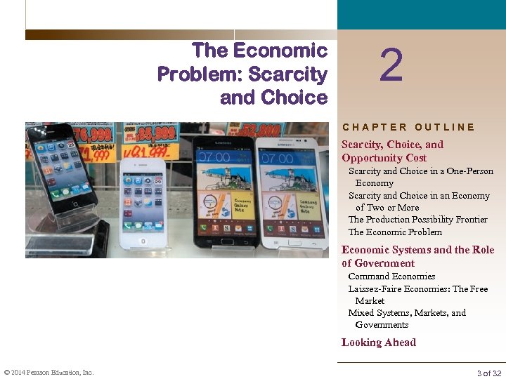 The Economic Problem: Scarcity and Choice 2 CHAPTER OUTLINE Scarcity, Choice, and Opportunity Cost Scarcity and Choice in a One-Person Economy Scarcity and Choice in an Economy of Two or More The Production Possibility Frontier The Economic Problem Economic Systems and the Role of Government Command Economies Laissez-Faire Economies: The Free Market Mixed Systems, Markets, and Governments Looking Ahead © 2014 Pearson Education, Inc. 3 of 32