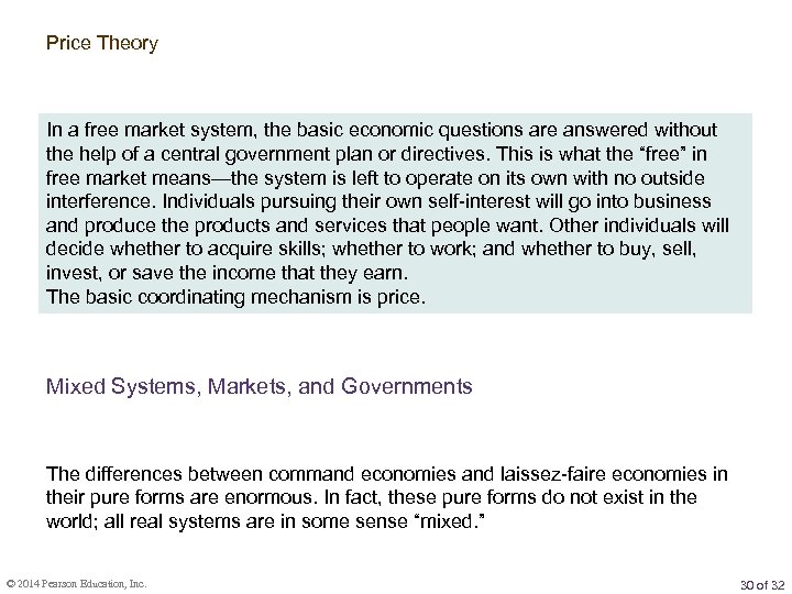 Price Theory In a free market system, the basic economic questions are answered without the help of a central government plan or directives. This is what the “free” in free market means—the system is left to operate on its own with no outside interference. Individuals pursuing their own self-interest will go into business and produce the products and services that people want. Other individuals will decide whether to acquire skills; whether to work; and whether to buy, sell, invest, or save the income that they earn. The basic coordinating mechanism is price. Mixed Systems, Markets, and Governments The differences between command economies and laissez-faire economies in their pure forms are enormous. In fact, these pure forms do not exist in the world; all real systems are in some sense “mixed. ” © 2014 Pearson Education, Inc. 30 of 32