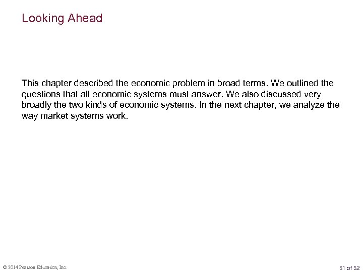 Looking Ahead This chapter described the economic problem in broad terms. We outlined the questions that all economic systems must answer. We also discussed very broadly the two kinds of economic systems. In the next chapter, we analyze the way market systems work. © 2014 Pearson Education, Inc. 31 of 32
