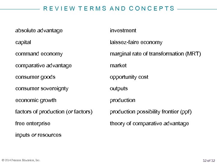 REVIEW TERMS AND CONCEPTS absolute advantage investment capital laissez-faire economy command economy marginal rate of transformation (MRT) comparative advantage market consumer goods opportunity cost consumer sovereignty outputs economic growth production factors of production (or factors) production possibility frontier (ppf) free enterprise theory of comparative advantage inputs or resources © 2014 Pearson Education, Inc. 32 of 32