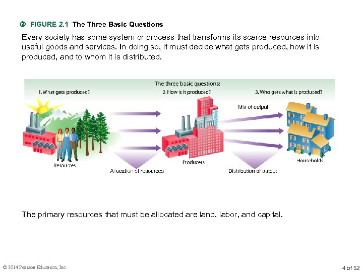 FIGURE 2. 1 The Three Basic Questions Every society has some system or process that transforms its scarce resources into useful goods and services. In doing so, it must decide what gets produced, how it is produced, and to whom it is distributed. The primary resources that must be allocated are land, labor, and capital. © 2014 Pearson Education, Inc. 4 of 32