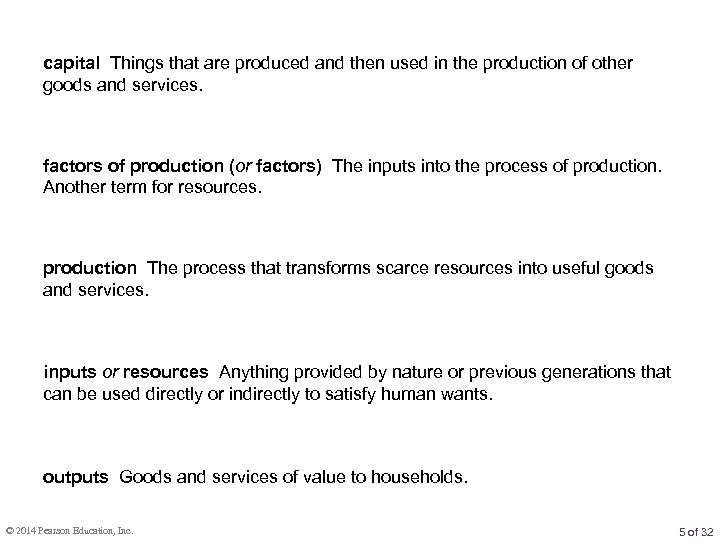 capital Things that are produced and then used in the production of other goods and services. factors of production (or factors) The inputs into the process of production. Another term for resources. production The process that transforms scarce resources into useful goods and services. inputs or resources Anything provided by nature or previous generations that can be used directly or indirectly to satisfy human wants. outputs Goods and services of value to households. © 2014 Pearson Education, Inc. 5 of 32