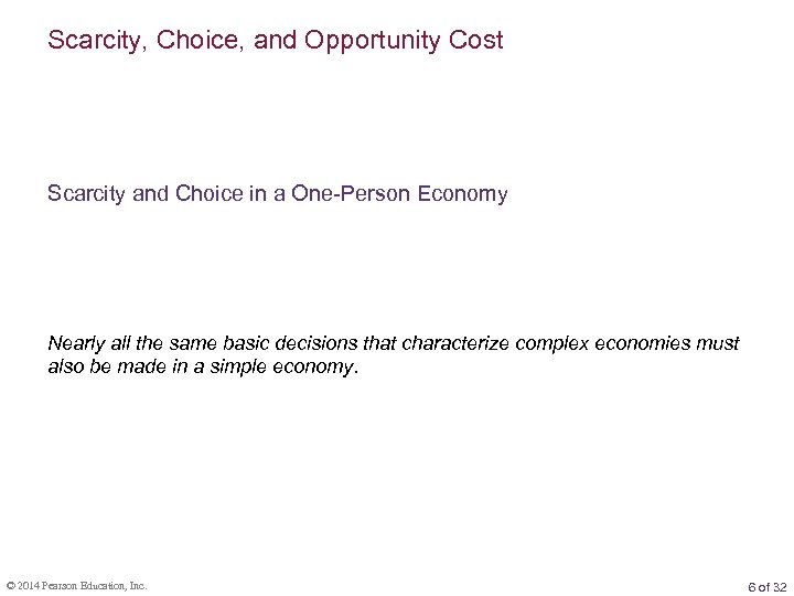 Scarcity, Choice, and Opportunity Cost Scarcity and Choice in a One-Person Economy Nearly all the same basic decisions that characterize complex economies must also be made in a simple economy. © 2014 Pearson Education, Inc. 6 of 32