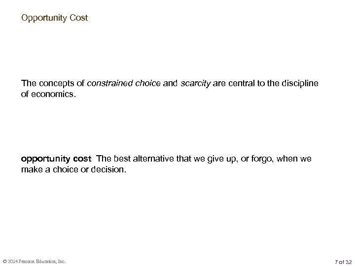 Opportunity Cost The concepts of constrained choice and scarcity are central to the discipline of economics. opportunity cost The best alternative that we give up, or forgo, when we make a choice or decision. © 2014 Pearson Education, Inc. 7 of 32