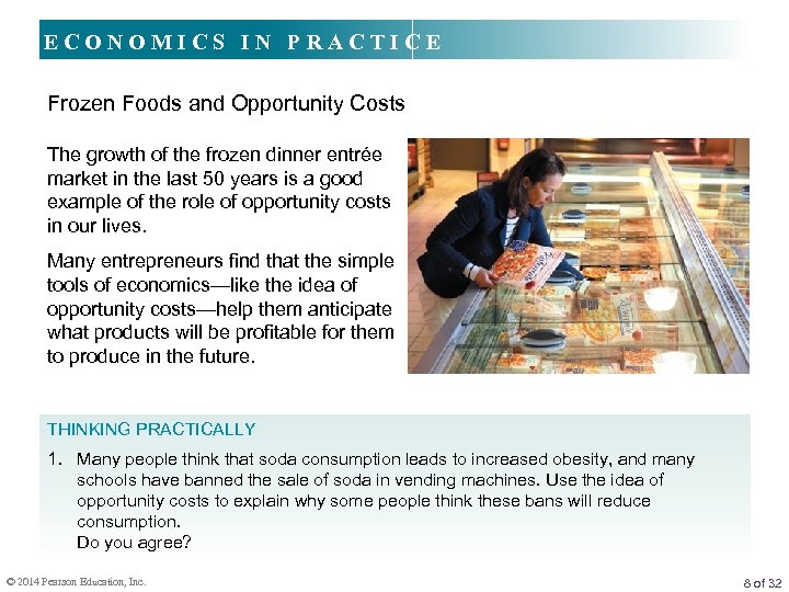 ECONOMICS IN PRACTICE Frozen Foods and Opportunity Costs The growth of the frozen dinner entrée market in the last 50 years is a good example of the role of opportunity costs in our lives. Many entrepreneurs find that the simple tools of economics—like the idea of opportunity costs—help them anticipate what products will be profitable for them to produce in the future. THINKING PRACTICALLY 1. Many people think that soda consumption leads to increased obesity, and many schools have banned the sale of soda in vending machines. Use the idea of opportunity costs to explain why some people think these bans will reduce consumption. Do you agree? © 2014 Pearson Education, Inc. 8 of 32