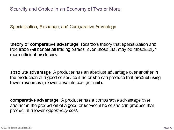 Scarcity and Choice in an Economy of Two or More Specialization, Exchange, and Comparative Advantage theory of comparative advantage Ricardo’s theory that specialization and free trade will benefit all trading parties, even those that may be “absolutely” more efficient producers. absolute advantage A producer has an absolute advantage over another in the production of a good or service if he or she can produce that product using fewer resources (a lower absolute cost per unit). comparative advantage A producer has a comparative advantage over another in the production of a good or service if he or she can produce that product at a lower opportunity cost. © 2014 Pearson Education, Inc. 9 of 32