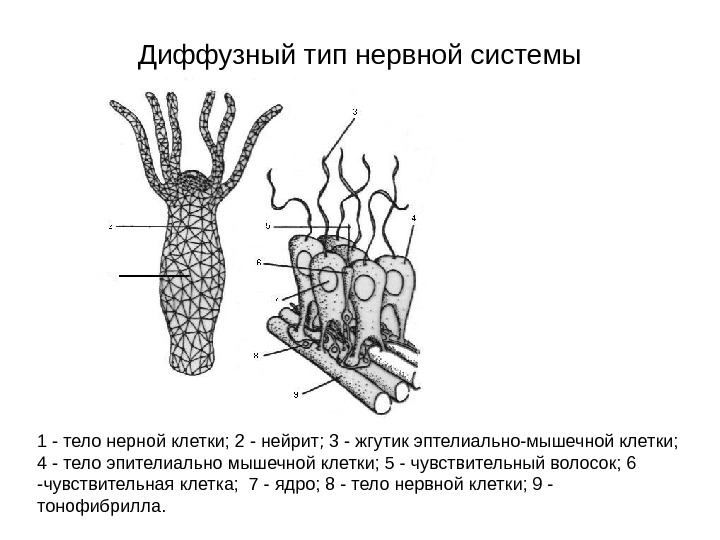Диффузный тип нервной системы 1 — тело нерной клетки; 2 — нейрит; 3 — жгутик эптелиально-мышечной клетки; 4 — тело эпителиально мышечной клетки; 5 — чувствительный волосок; 6 -чувствительная клетка; 7 — ядро; 8 — тело нервной клетки; 9 — тонофибрилла.