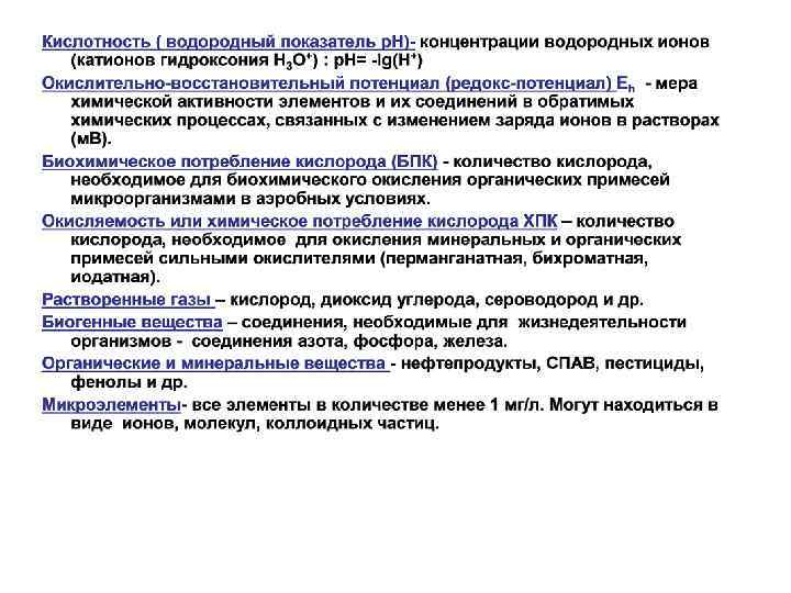 Группы дисперсности водных систем Размер частиц, см 10 -2 – 10 -4 грубодисперсные взвеси и суспензии 10 -5 - 10 -6 коллоидно-дисперсные Вещества глины, мелкий песок, карбонатные породы (мел, гипс) малорастворимые гидроксиды металлов ил, планктон, бактерии, вирусы органоминеральные частицы почв и грунтов, гумусовые вещества 10 -6 -10 -7 растворимые в воде газы и органические соединения 10 -7 -10 -8 соли неорганических кислот, диссоциированные на ионы молекулярные растворы придают воде мутность Придают воде привкусы, запахи, окраску