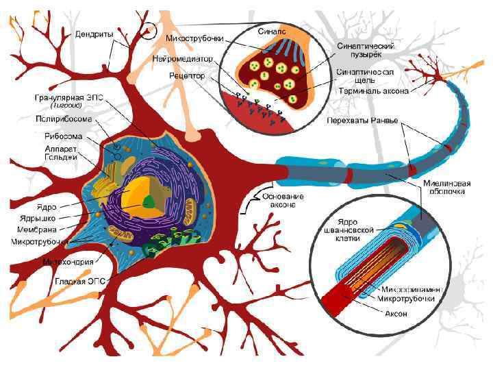 • Центр процеccoв синтеза в нервной клетке – ее тело (сома), которое содержит ядро, рибосомы, эндоплазматический ретикулум и др. органеллы, здесь синтезируются медиаторы и клеточные белки. • При разрушении сомы дегенерирует вся клетка, включая аксон и дендриты. • Специфической функцией аксона является проведение нервных импульсов, которые возникают в результате небольших изменений проницаемости мембраны аксона и проходят по всей длине аксона.