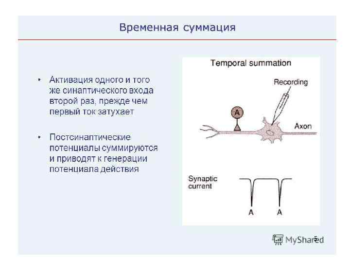 • Пространственная суммация связана с суммированием возбуждающих постсинаптических сигналов, возникающих одновременно в разных синапсах одного нейрона
