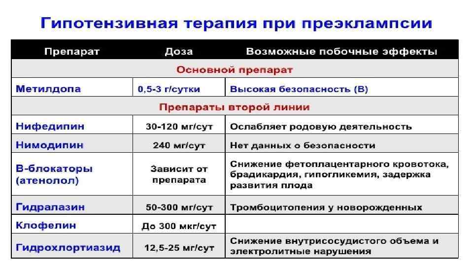 Антигипертензивная терапия Критерии начала терапии при ПЭ: АД ≥ 140/90 мм. рт. ст Целевой (безопасный для матери и плода) уровень АД при проведении антигипертензивной терапии: САД 130150 мм. рт. ст ДАД 80 -95 мм. рт. ст Сульфат магния не рекомендован как антигипертензивное средство В послеродовом периоде может использоваться урапидил Основными ЛС для лечения АГ при беременности является: -метилдопа Нифедипин Метопролол Противопоказаны: ингибиторы АПФ, антагонисты рецепторов ангиотензина 2, спиронолактон, антагонисты кальция дилтиазем и фелодипин